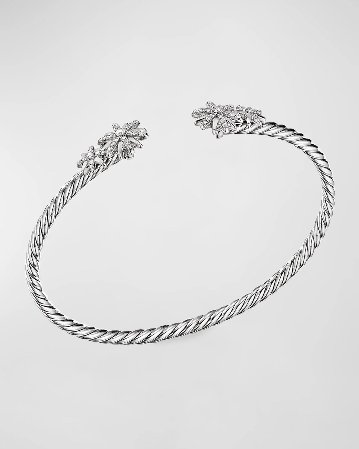 David Yurman split bangle bracelet. Polished sterling silver hardware. Starburst motifs with diamonds. 0.28 total diamond carat weight. Split opening eases dress. Approx. 3.5mm. Made in Italy.