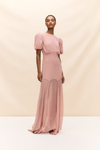 The Agua Maxi Dress in blush crinkle chiffon showcases a true signature De La Vali gown. This lightweight crinkle chiffon dress boasts a semi-fitted bodice with bust ruching, a fluid fishtail skirt that is semi-sheer, and voluminous puff sleeves accented with internal organza ruffles to create a dramatic, feminine silhouette. This style is crafted from a lightweight crinkle chiffon selected for its delicate drape and flow. This style is selected for its romantic and airy feel. No wonder it is one of our founder's favourite pieces. - Full length maxi dress - Skirt is semi-sheer - High round neck with puff sleeves - Main body is lined for modesty - Suitable for wearing a bra - Fitted bodice with princess seam detail - Concealed zip at centre back PRODUCT DETAILS & FIT - Designed to skim the body - Dress is accessed through concealed zip at centre back - Fits true to size, select your normal size - Dress length: 154cm Model is 173cm / 5” 7 wearing a UK8 / US 4 / EU 36 Dry clean only This style can be altered in length and fit Designed in Ibiza & London