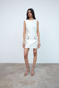 The Ayda Mini Dress is a sculptural silhouette defined by clean lines and quiet elegance. Cut to skim the body with soft structure, a streamlined neckline and subtle shaping through the waist create a poised, intentional line. Crescent moon–shaped hardware anchors the design, introducing a refined celestial detail that feels both modern and instinctive. Minimal yet expressive, Ayda moves with confidence and calm authority. Fitted bodice Balloon skirt Slash neckline Concealed centre back zip Crescent hardware PRODUCT & FIT Fits true to size 85% Polyester 15% Nylon Dress length: 82cm (UK8) Designed in London & Ibiza Model is 175cm / 5” 9” - Size UK 6 wearing a size UK 8 to fit effortlessly.