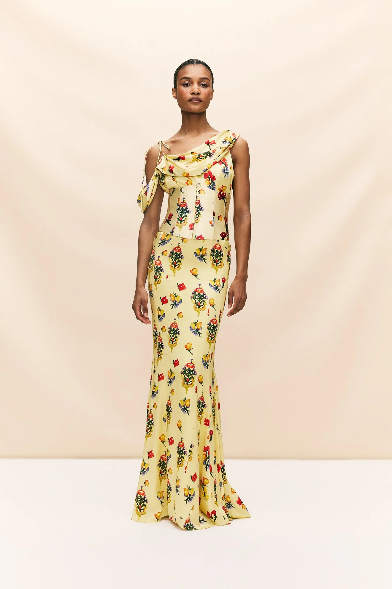 The most striking silhouette that playfully signifies the collection narrative, with gathered ruched satin and detachable corseted bodice, an irresistible conversation piece in an exclusive De La Vali print for the approaching Spring wedding season and beyond. PRODUCT DETAILS AND FIT - Maxi dress - Cross shoulder sash with ruched, voluminous fabric - Detachable corset - Fits true to size - Adjustable tie strap on one shoulder - Asymmetric hemline - Pleating on hip This style is crafted from a stretch silk satin selected for its drape and luxe hand feel. The stretch in the silk allow for the most flattering and comfortable silhouette. Dry clean only Designed in London and Ibiza