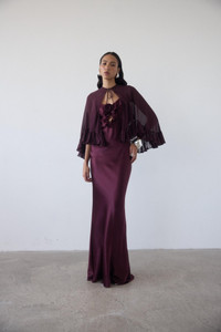 Floor length, maxi dress Ruffled cut out bust detail with rose applique Bias cut skirt Skinny straps Cape sold separately PRODUCT & FIT Fits true to size Dress Length: 147cm (UK8) 52% Silk, 40% Rayon, 8% Spandex Dry Clean Only Designed in London & Ibiza Model is 5’10 / 178cm wearing a UK8 / US 4 / EU 36