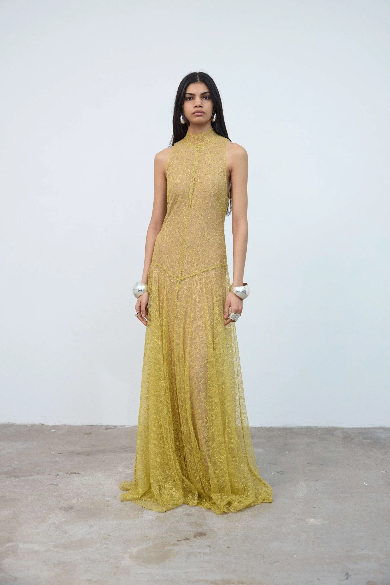 The Foehn Maxi Dress is a floor-length silhouette designed to trace the body with elongated, ethereal ease. Crafted in delicate lace, it features a high neckline and fluid lines that follow the form before releasing into a softly flowing hem. Light passes through the fabric, revealing depth and movement as it shifts between shadow and glow. Elegant yet elemental, Foehn captures the collection’s lunar spirit—poised, atmospheric and endlessly captivating. High neck maxi dress Full circle skirt Fitted bodice V-shape dropped waist seam Concealed centre back zip Removable maxi mesh slip PRODUCT & FIT Fits true to size 39% Rayon, 61% Nylon Dress Length: 155cm (UK8) Designed in London & Ibiza Model is 175cm / 5” 9” - Size UK 6 wearing a size UK 8 to fit effortlessly.