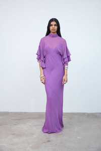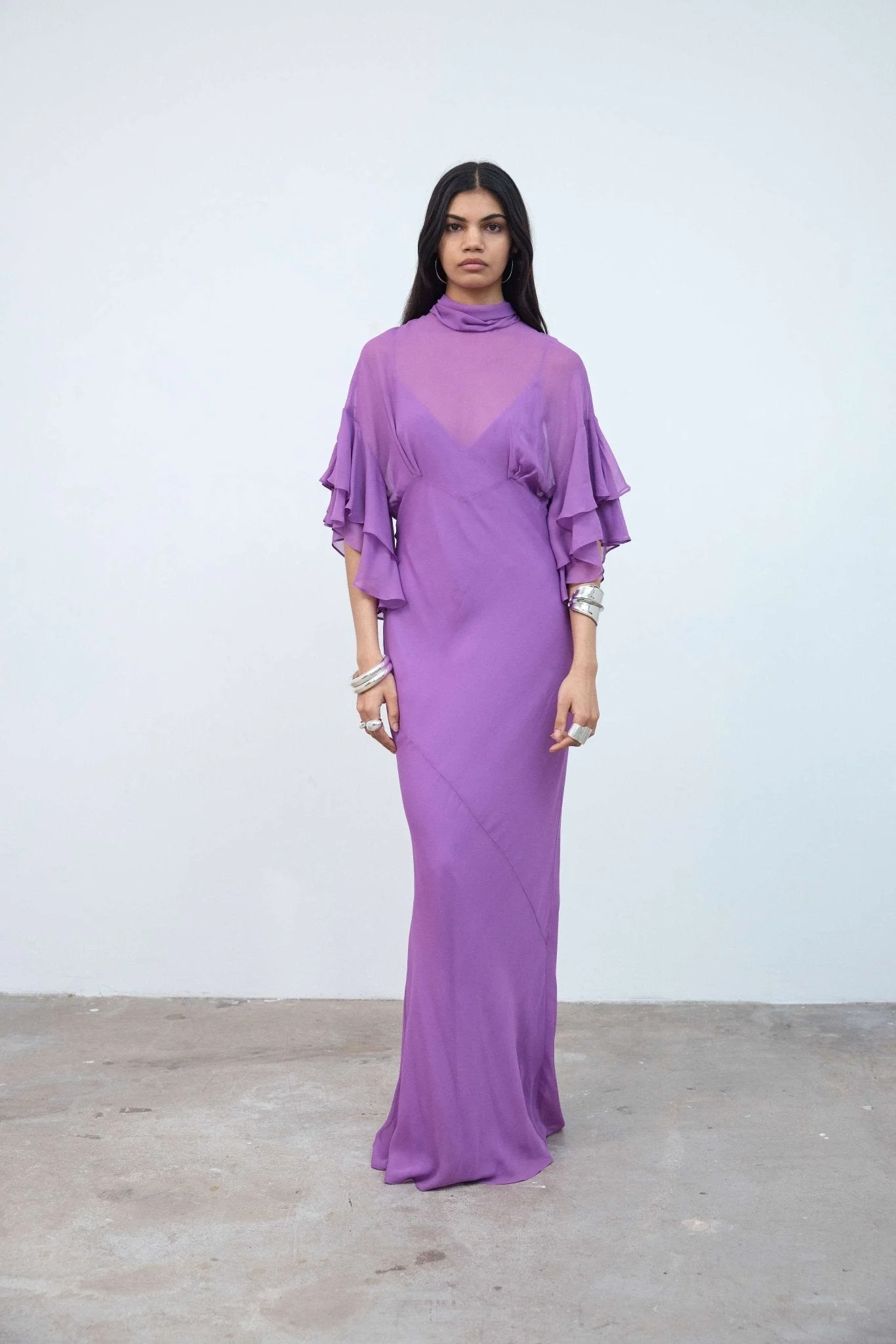 The Lena Maxi Dress is crafted from flowing viscose georgette, skimming the body with a lightness that feels both refined and instinctive. A high neckline balances gently draped sleeves that fall into soft, cascading layers, creating movement with every step. The silhouette elongates effortlessly, combining quiet drama with an ease that feels natural rather than styled. Aa elegant expression of modern femininity, designed to move seamlessly from day into night. High neck maxi dress Bias cut Layered short ruffle sleeves Neck tie detail Removable maxi slip dress PRODUCT & FIT Fits true to size 100% viscose Dress length: 150cm (UK8) Designed in London & Ibiza Model is 175cm / 5” 9” - Size UK 6 wearing a size UK 8 to fit effortlessly.