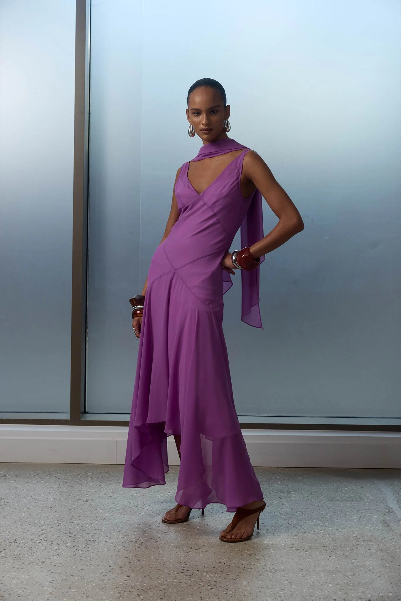The Mystica Dress is a fluid silhouette cut from lightweight viscose georgette, designed to move with softness and intent. A gently draped neckline and bias-cut skirt create an elongated line through the body, while a sheer scarf detail trails the neck, adding movement and airiness as the fabric shifts. The design falls into a softly fluid handkerchief hem, creating subtle movement with every step. V shaped neckline Bias cut Seam detailing Detachable scarf Asymmetrical handkerchief hem Detachable slip PRODUCT & FIT Fits true to size 100% Viscose Dress length: 114.5cm (UK8) Designed in London & Ibiza Model is 175cm / 5” 9” - Size UK 6 wearing a size UK 8 to fit effortlessly.