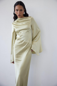 Asymmetric grown on neck Gathered detail at neck Dramatic long pagoda style sleeves Asymmetric waist seam Bias cut skirt Centre back zip PRODUCT & FIT Fits true to size Dress Length: 158cm (UK8) 52% Silk 40% Rayon 8% Spandex Dry Clean Only Designed in London & Ibiza Model is 5’10 / 178cm wearing a UK8 / US 4 / EU 36