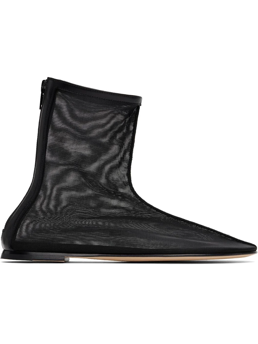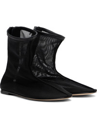 Ankle-high handcrafted sheer mesh boots in black. · Buffed leather trim throughout · Pinched seam at vamp · Zip closure at heel · Logo stamp at padded leather footbed · Stacked leather heel with rubber injection · Nubuck sole Supplier color: Black Upper: textile. Sole: rubber. Made in Italy 251282F113000