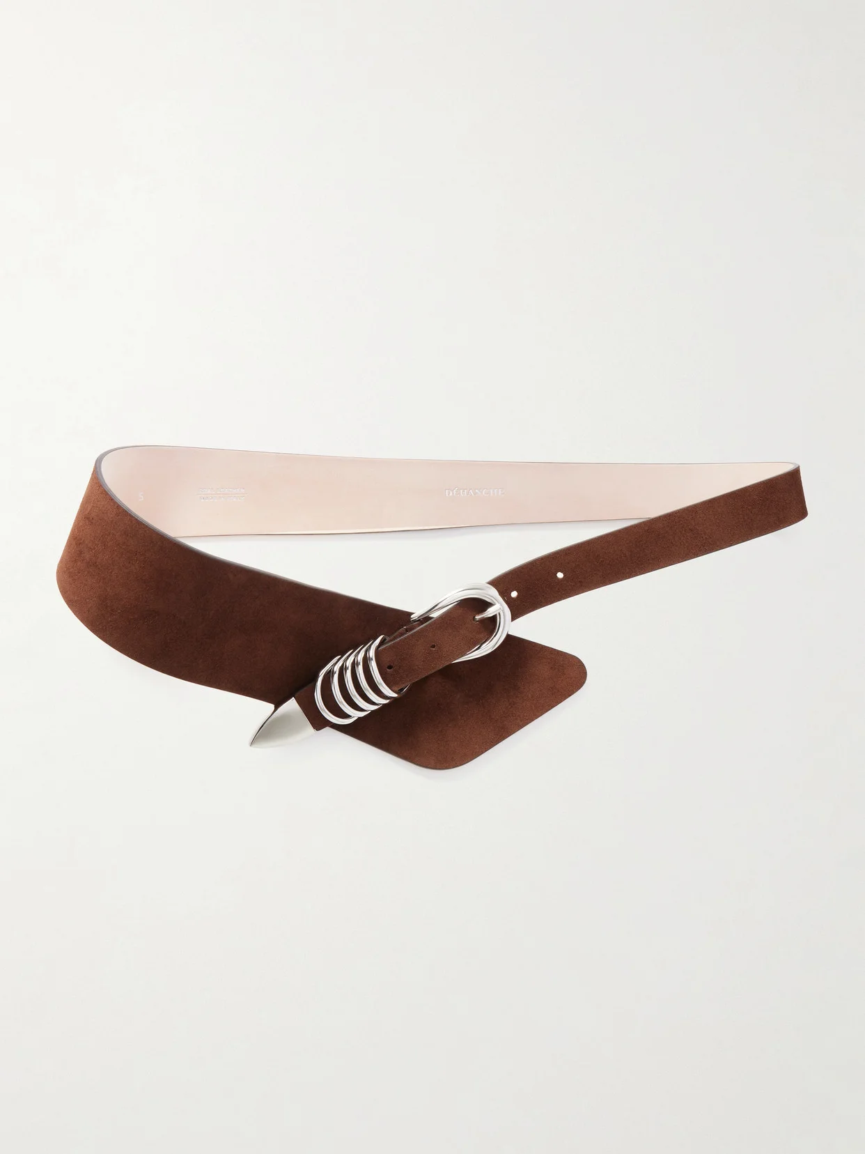 EXCLUSIVE AT NET-A-PORTER. "Elevating accessorizing to an art form" is Dehanche's core mission. Handcrafted in Italy from suede, this 'Alcott' belt has a tapered V-shape and a silver-tone buckle to match the row of rings and end tip. Use yours to cinch a dress or blazer. Lower-Impact Materials. This product is made using at least 50% lower-impact materials or ingredients. Find out more about our NET SUSTAIN criteria here.