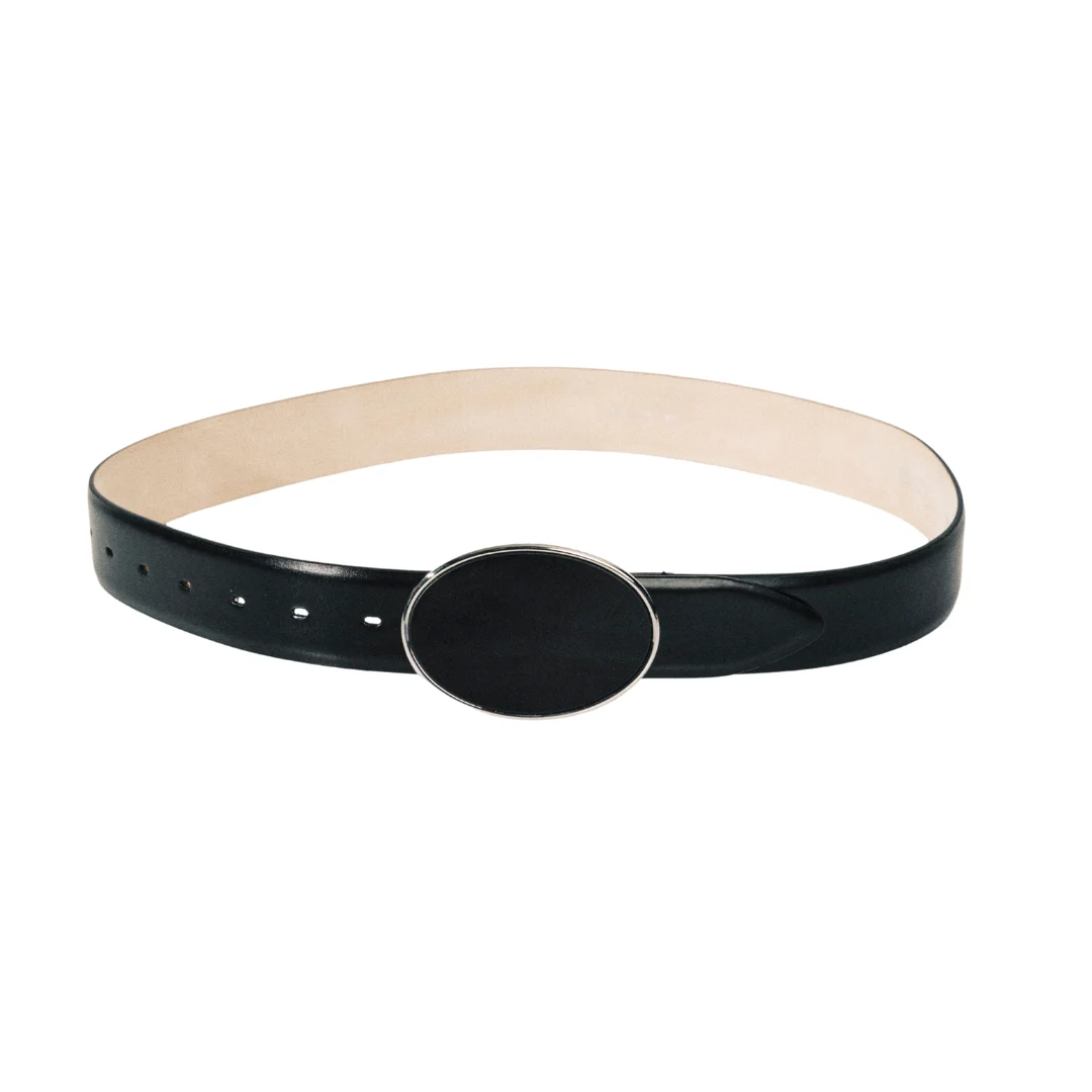 The Flint belt reimagines Western heritage through minimalist oval lines and sculptural silver-tone detailing, handcrafted in Italy for refined everyday impact. - Handcrafted in Italy - Silver Hardware - Genuine suede lining - Western Inspired Oval Buckle - Permanent Collection - Responsibly sourced leather (LWG-certified)