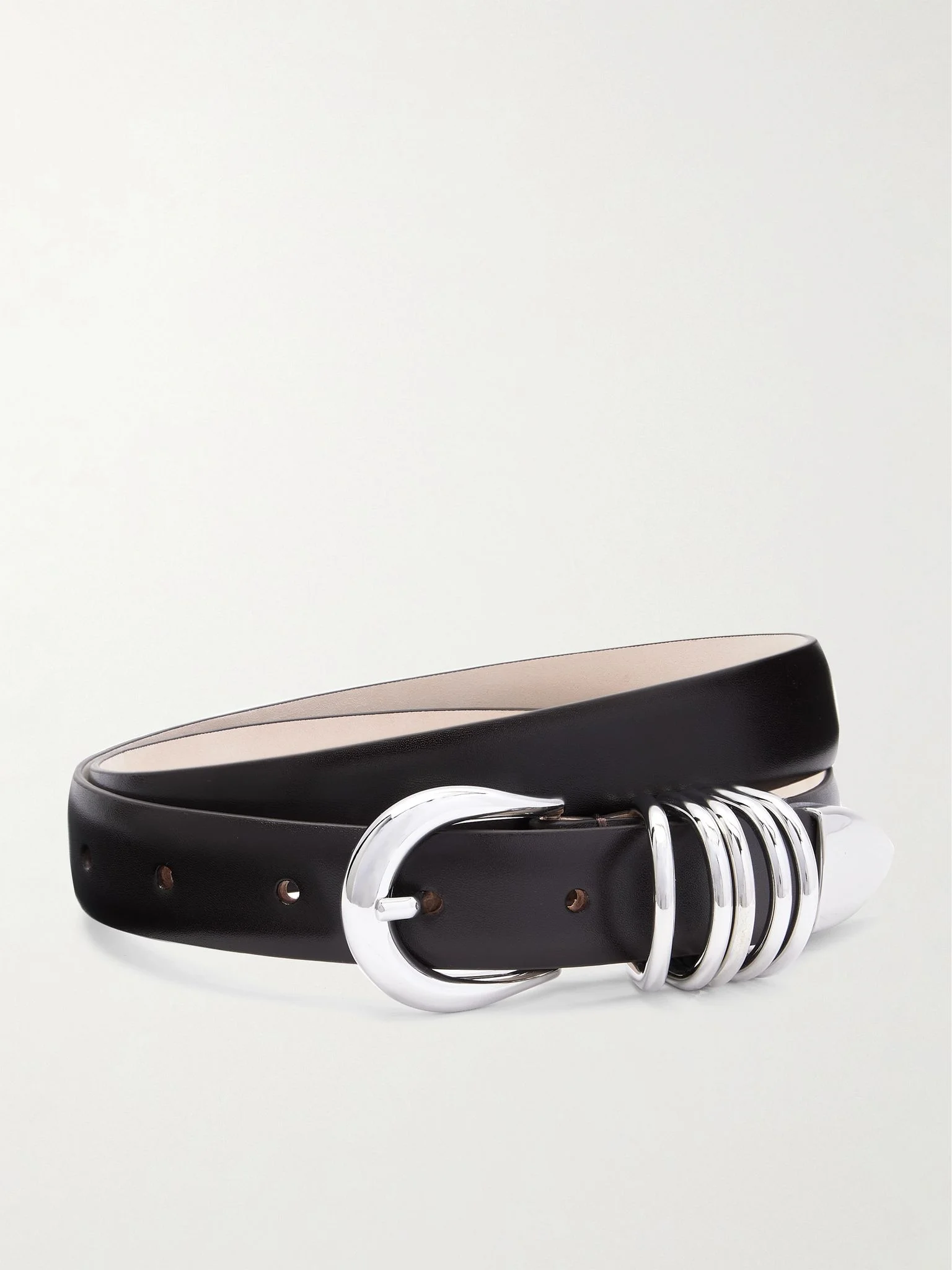 Dehanche believes that a good belt can be "the most elegant accessory in your wardrobe." Handcrafted in Italy, this 'Hollyhock' style is made from smooth leather and has a silver-toned buckle fastening with a row of rings instead of a simple loop. Lower-Impact Materials. This product is made using at least 50% lower-impact materials or ingredients. Find out more about our NET SUSTAIN criteria here. Size & Fit - Designed to be worn on the hips or waist - Measurements can be found in the link below Details & Care - Dark-brown leather (Calf) - Buckle fastening - By purchasing this product, you are supporting responsible leather manufacturing through Leather Working Group.