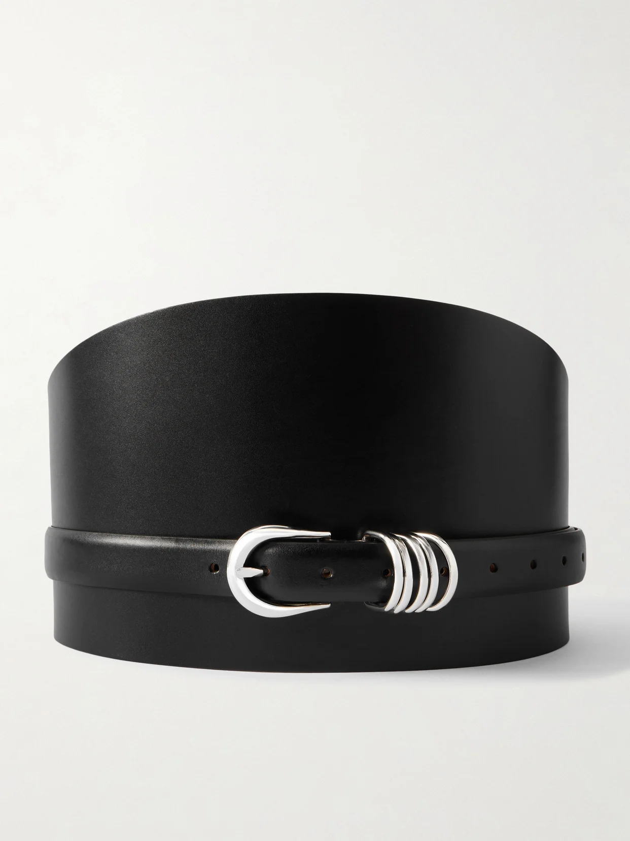 Meant to be worn on the waist, Dehanche's belt has a wide shape that will create an hourglass shape. It's crafted from leather and has a silver-tone buckle and the brand's signature five rings instead of a simple keeper. Lower-Impact Materials. This product is made using at least 50% lower-impact materials or ingredients. Find out more about our NET SUSTAIN criteria here.