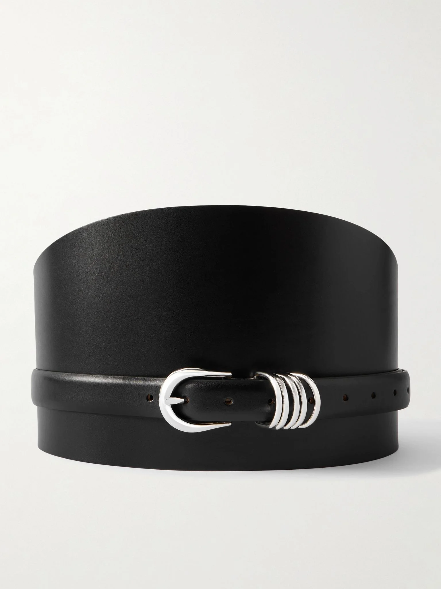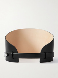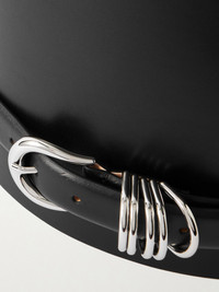 Meant to be worn on the waist, Dehanche's belt has a wide shape that will create an hourglass shape. It's crafted from leather and has a silver-tone buckle and the brand's signature five rings instead of a simple keeper. Lower-Impact Materials. This product is made using at least 50% lower-impact materials or ingredients. Find out more about our NET SUSTAIN criteria here. Size & Fit - Designed to be worn on the waist - Measurements can be found in the link below Details & Care - Black leather (Calf) - Buckle fastening - By purchasing this product, you are supporting responsible leather manufacturing through Leather Working Group.