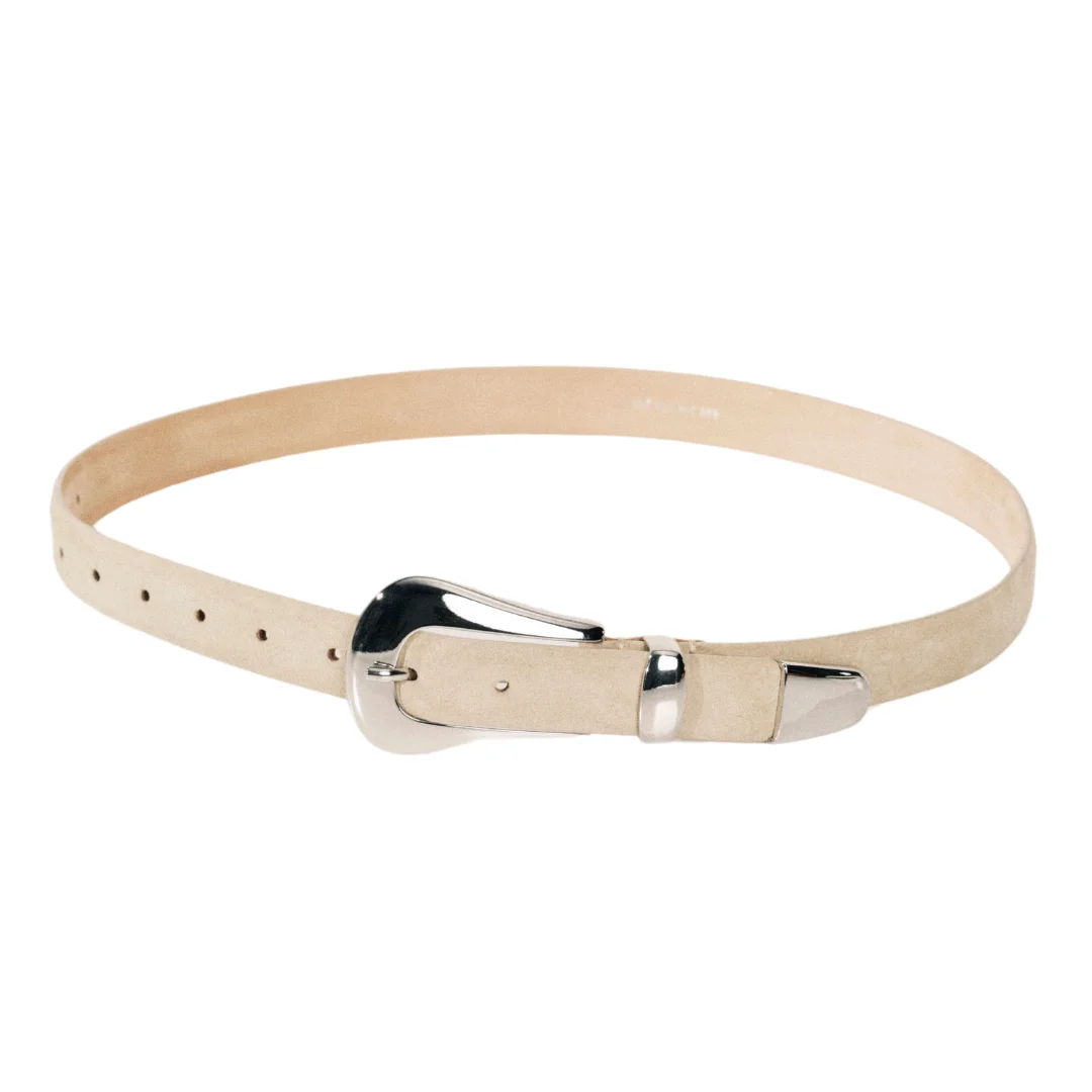 This western inspired style of Dehanche radiates a subtle yet sophisticated aesthetic that encapsulates the essence of edgy dressing. The belt is handcrafted in Italy from luxurious calfskin suede and signature beige suede lining. The shining silver hardware buckle, rings and belt-tip add polish to any look. - Features 10 holes to accommodate a broader range of sizes, allowing for styling options both on the hips and slung around the waist. - The 1-inch width is ideal for wearing through all sizes of belt loops, ensuring a seamless and stylish fit. - Crafted from zamak, the metal hardware is coated in nickel-free silver that is safe for those with metal allergens.