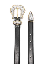 Santo buckle belt Highlights - Black - Gold-tone detailing - Silver-tone detailing - Buckle fastening - Floral detailing - Pointed tip Made in Italy Composition Calf Leather 100% SIZE & FIT Measurement Minimum Length 26.37 in(67 cm) TOTAL LENGTH 35.03 in(89 cm) WIDTH 0.78 in(2 cm)