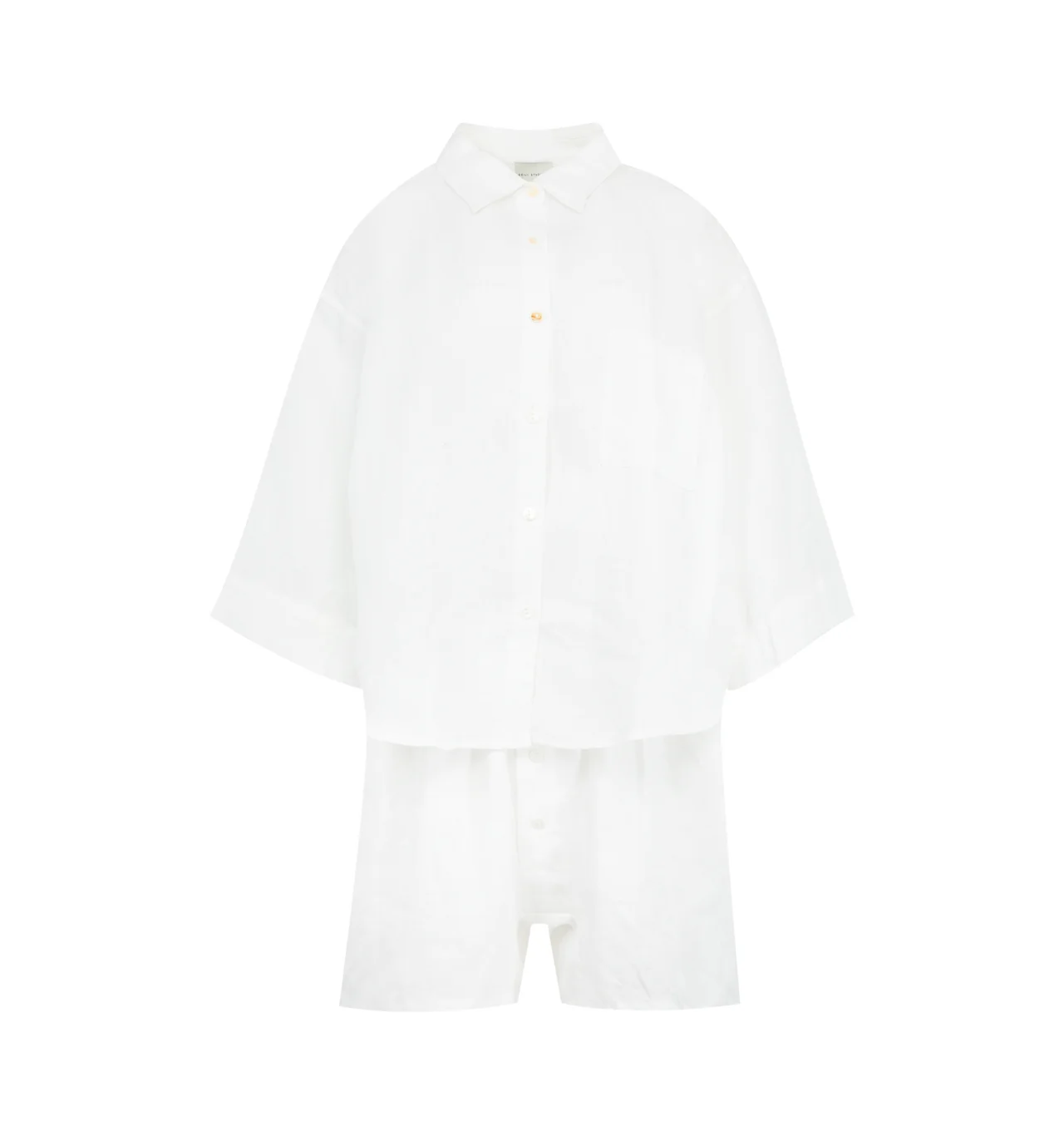 DEIJI STUDIOS 03 Set featuring an oversized box fit linen shirt with wide arms and a front pocket. Mid rise, loose fitting boxer style shorts with a faux button down fly and an elastic waist for extra comfort. 100% OEKO-TEX 100 certified, GOTS certified organic and EU certified stone washed french linen. DESIGNER STYLE ID: SS25-35-WHT COLOR: WHITE