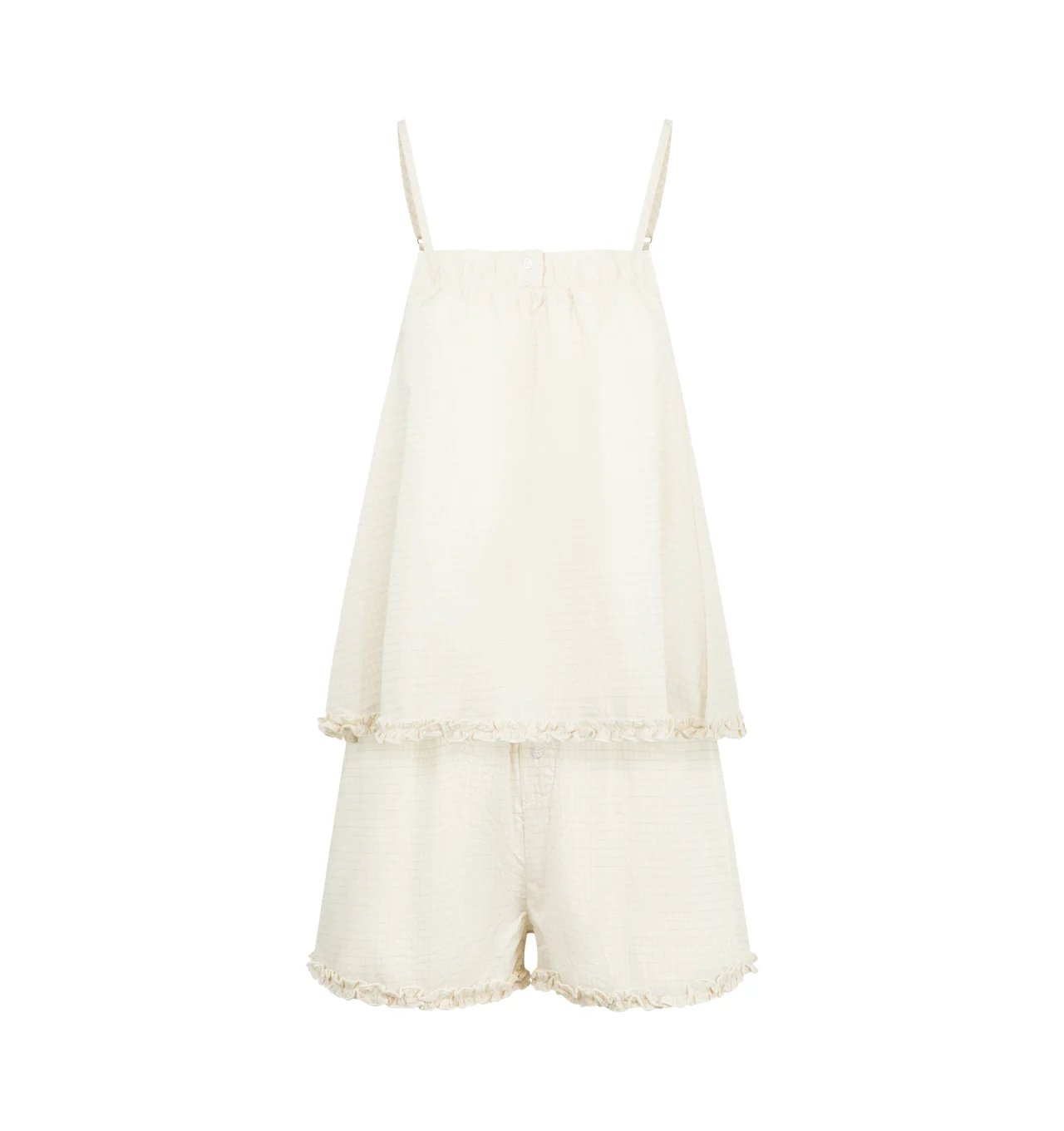 DEIJI STUDIOS Yoke Set featuring relaxed babydoll top, straight neckline with button closure, gathered yoke seam, lettuce frill hem detail and fine, adjustable straps pairs back with an easy pull on short featuring double button detailing, elastic waistband and baby lock lettuce frill hem. 100% organic cotton poplin. DESIGNER STYLE ID: RS26-13-BNC COLOR: BONE CHECK