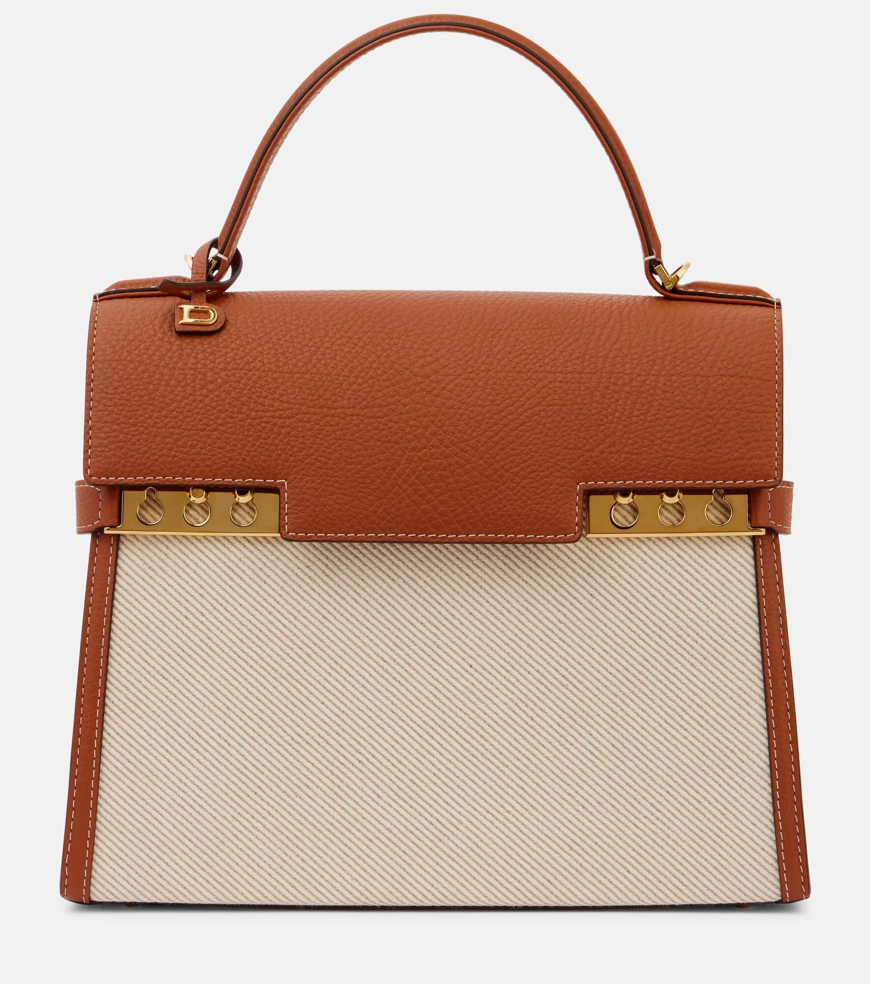 Inspired by the trapeze of a sailboat, the Tempete is defined by its elegant lines, refined silhouette, and iconic studded clasps. Crafted from Delvaux’s Sequoia Calf leather and canvas, this MM Tempete arrives here in Natural and Tan, and is complete with gold hardware and signature studded clasps on the front flap. Product Details - Material: canvas, calf leather - Lining: calf leather - Made in France - Color: neutrals - Designer color name: Natural - Tan - Item color: brown - Internal details: single compartment, internal zipped pocket, hand-held mirror - Top handle, Detachable shoulder strap - Hardware color: gold - Item number: P01063867 Size & Fit - Height 23cm-9" - Width 27,5cm-11" - Depth 9cm-3.5"