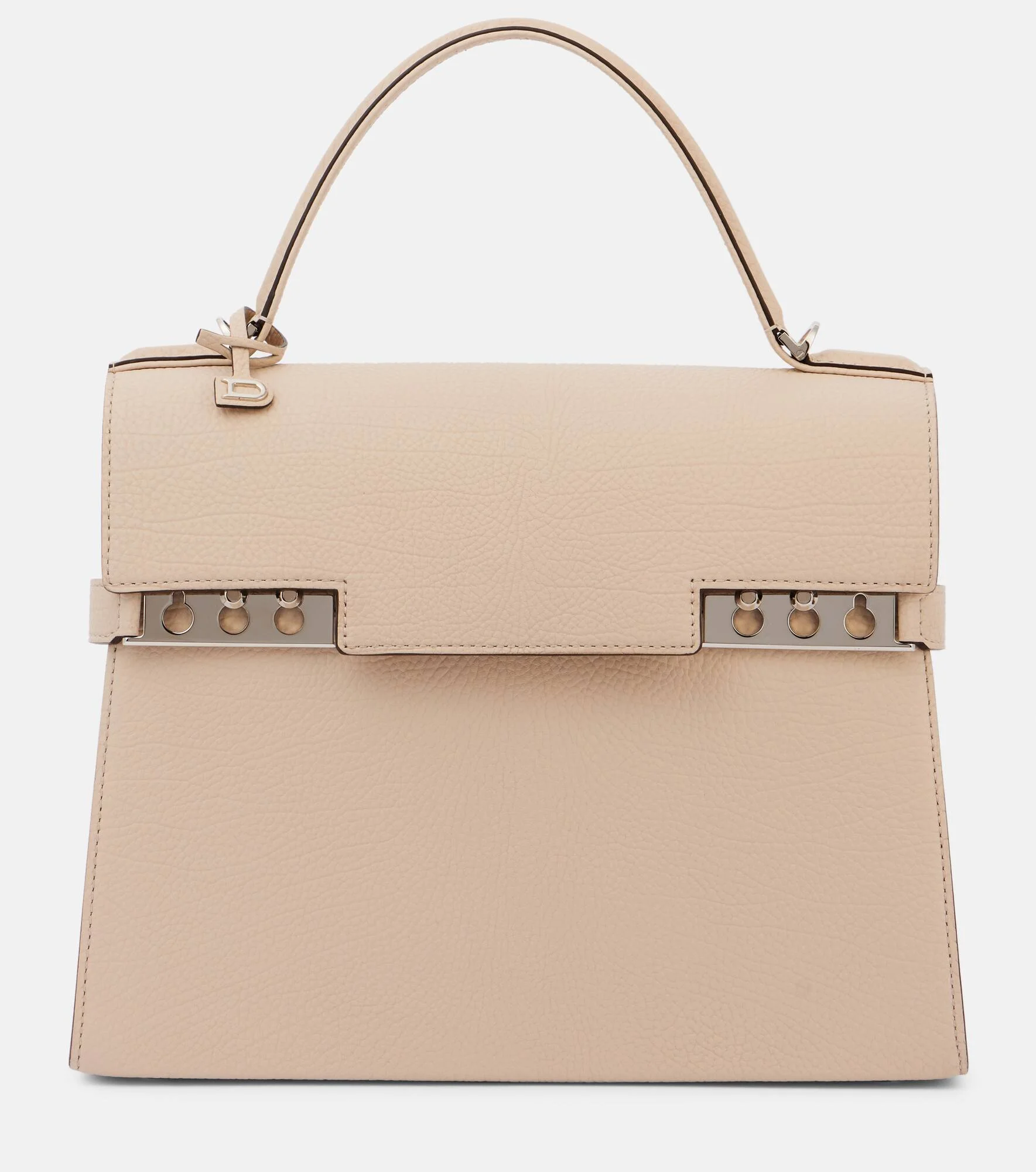 Inspired by the trapeze of a sailboat, the Tempete is defined by its elegant lines, refined silhouette, and iconic studded clasps. Crafted from Delvaux’s Crispy Calf leather, this MM Tempete arrives here in Sesame, and is complete with silver hardware and signature studded clasps on the front flap. Product Details - Material: leather - Lining: leather - Made in France - Color: beige - Designer color name: Sesame - Item color: beige - Internal details: single compartment, internal zipped pocket - Top handle, Detachable, adjustable shoulder strap - Hardware color: silver - Item number: P01063874 Size & Fit - Length 27,5cm-11" - Height 23cm-9" - Width 9cm-3.5"