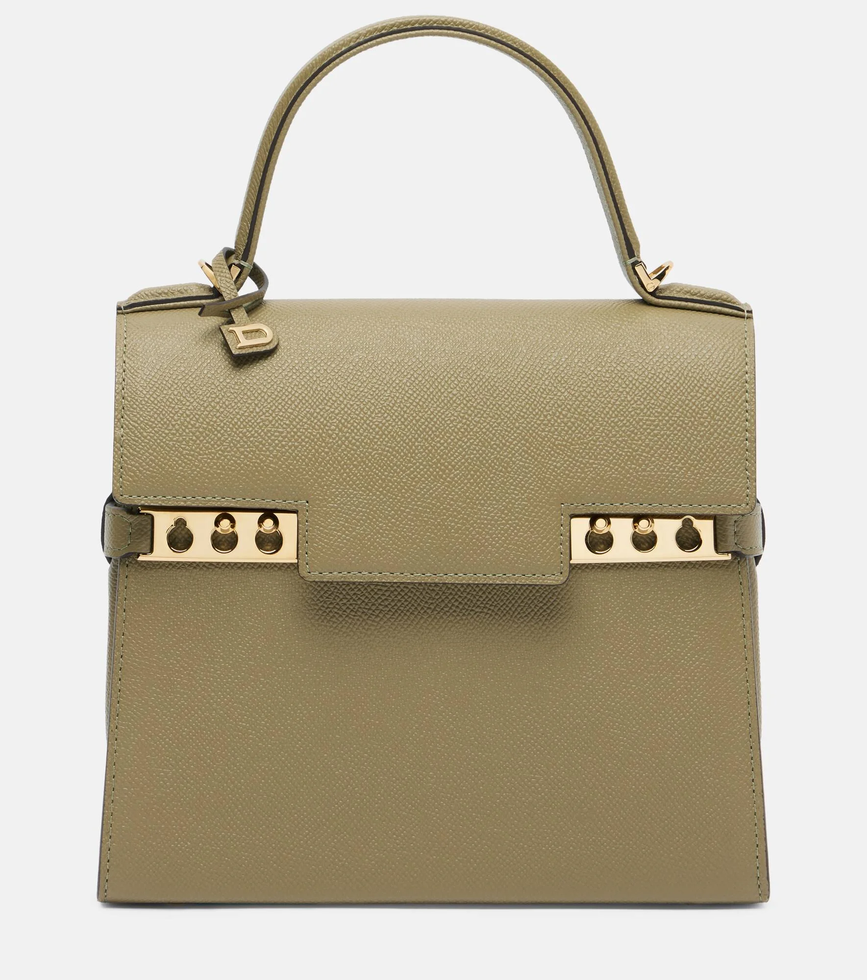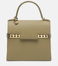 Inspired by the trapeze of a sailboat, the Tempete is defined by its elegant lines, refined silhouette, and iconic studded clasps. Crafted from Delvaux’s Alpina Calf leather, this PM Tempete arrives here in Argile, and is complete with hardware and signature studded clasps on the front flap. Product Details - Material: calf leather - Lining: calf leather - Made in France - Color: green - Designer color name: Argile - Item color: green - Hardware color: gold - Top handle - Internal details: internal slot pocket, single compartment - Closure: magnetic-tab fastening - Protective feet - Includes: detachable mirror - Item number: P01098718 Size & Fit - Height 19cm-7.5" - Width 21.5cm-8.5" - Depth 8cm-3" - Length of handles 25cm-10" - Adjustable shoulder strap - Min. length shoulder strap 90cm-35.5" - Max. length shoulder strap 122cm-48"