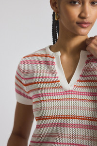 Add a fresh pop to your everyday rotation with the Andy Short Sleeve Sweater, seen here in a eye-catching horizontal stripe. Made from a breathable mesh knit, it feels soft and airy with a subtle sheer finish. The sweater is slightly cropped, with a relaxed fit. Complete with ribbed trims all over for added texture, and a split neckline for a casual look. SKU: TP519355YBA - 75% Cotton, 25% Polyamide - Imported SIZE & FIT Length from shoulder to hem is 19.5". Sleeve Length is 7.75", based on a size S. Our model is 5’10” and is wearing a size S. This style runs true to size. FEATURES & DETAILS - Dry clean only
