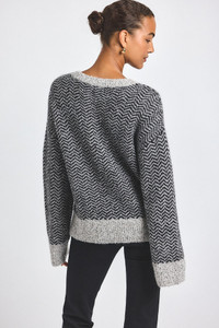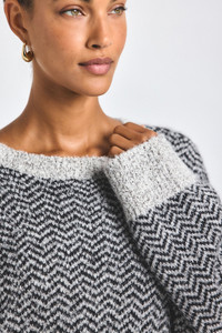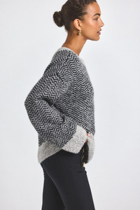 Make Astrid the newest addition to your knitwear collection. Undeniably soft and extra cozy, the sweater is crafted in a herringbone jacquard print. It’s made for an oversized silhouette, with exaggerated, wide sleeves. Features rib trim on the collar, hem and cuffs. SKU: TF529398YMB - 45% Nylon, 28% Alpaca, 27% Wool - Imported SIZE & FIT Length from shoulder to hem is 22.5” | Sleeve Length is 30.75",based on a size S. Our model is 5’9” and is wearing a size S. This style runs true to size. FEATURES & DETAILS - Dry clean only