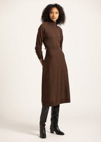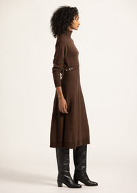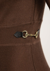 The Becky Raglan Horsebit Sweater Dress is crafted from a compact merino wool knit. The feminine fit-and-flare silhouette is accentuated by a ribbed waist panel finished with a gold horse-bit hardware and black leather tabs. It features a turtleneck, drop shoulders, long sleeves and a fluid shape that falls below the knee. SKU: TCOP9073YMD - 100% Wool - Imported SIZE & FIT Model is 5'10 wearing a size S. This style runs true to size. FEATURES & DETAILS - Dry clean only