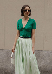 The Belle Twist Top is an elevated take on the classic tee, made from a soft, compact ribbed knit. It features short sleeves and a V-neckline that tapers elegantly into a front twist detail. Diagonal seams below the bust bring a flattering accent to the waist. SKU: TP529030YVI - 83% Viscose, 17% Polyester - Imported SIZE & FIT Length from shoulder to hem is 19" | Sleeve Length is 14.5", based on a size S. Our model is 5’10” and is wearing a size S. This style runs true to size. FEATURES & DETAILS - Dry clean only