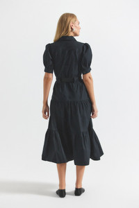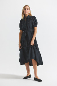 The Buffy Utility Dress in cotton poplin features two front cargo pockets on the chest with large buttons down the front and a relaxed body. Cinch the adjustable self-belt for a more pronounced waist shape. The long-tiered silhouette is cut from a cotton poplin that falls to the ankle. It is finished with puff sleeves and a collared neckline. If you are between sizes, please size down. SKU: TC005157COP - 100% Cotton - Imported SIZE & FIT Length from shoulder to hem is 47”, Sleeve Length is 19", based on a size 2. Model is 5’9.5” wearing a size 2. This style runs true to size. FEATURES & DETAILS - Dry clean only