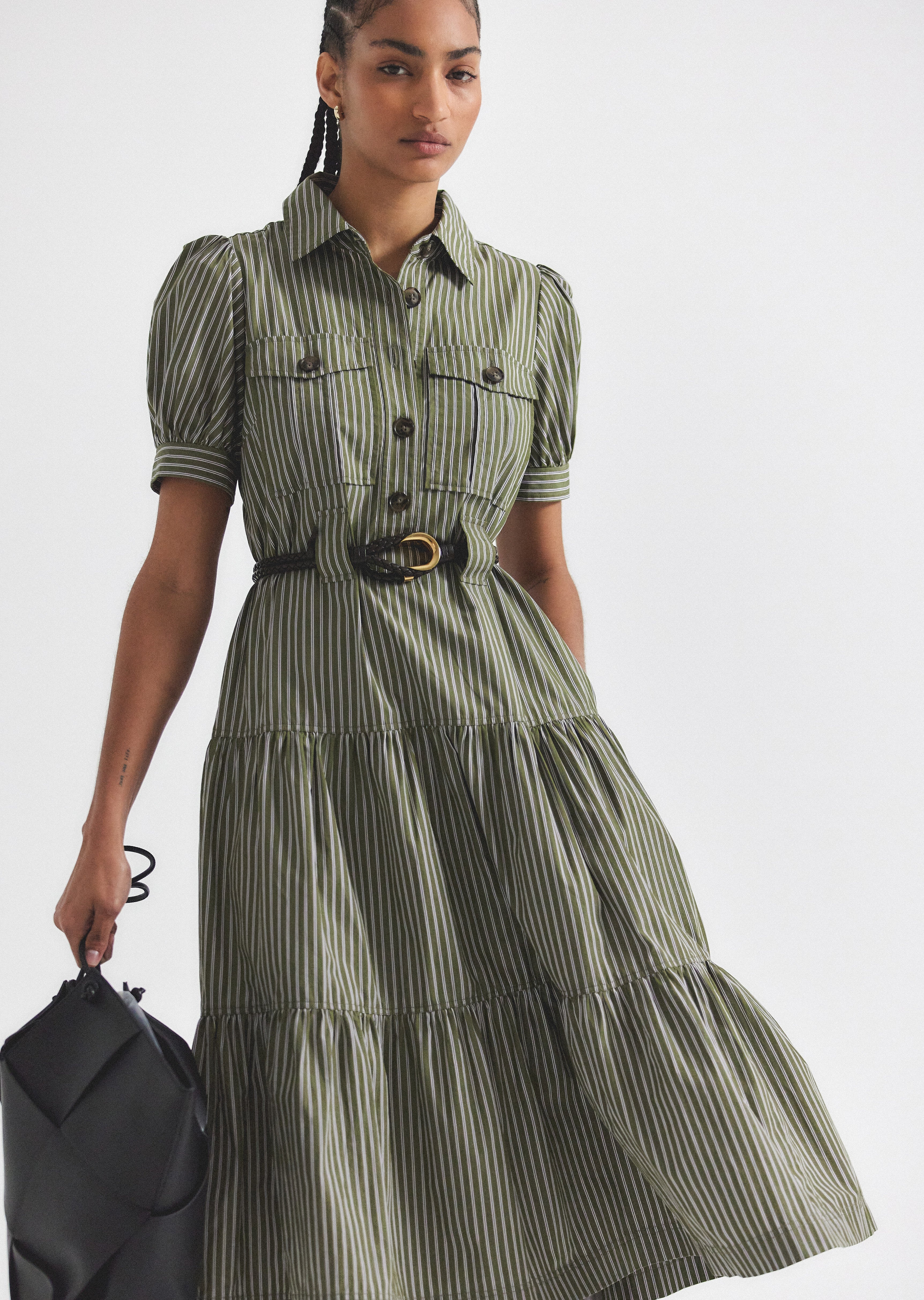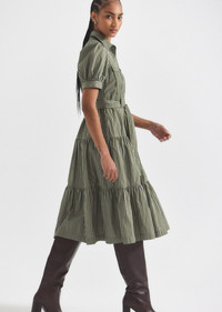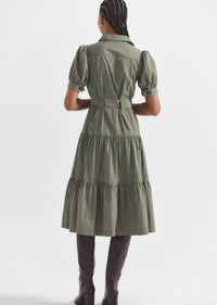 The Buffy Utility Dress in 100% cotton features two front cargo pockets on the chest with large buttons down the front and a relaxed body. Cinch the adjustable self-belt for a more pronounced waist shape. The long-tiered silhouette is cut from a cotton poplin that falls to the ankle. It is finished with puff sleeves and a collared neckline. SKU: TR525157CSS - 100% Cotton - Imported SIZE & FIT Model is wearing a size 2. Height 5’10” / Bust 33'' 1/2 / Waist 25'' / Hips 34'' 1/2 This style runs true to size. FEATURES & DETAILS - Dry clean