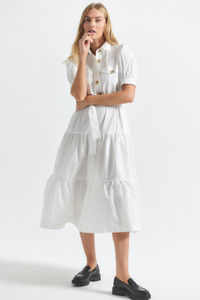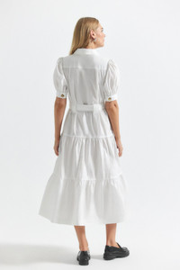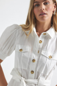 The Buffy Utility Dress in cotton poplin features two front cargo pockets on the chest with large buttons down the front and a relaxed body. Cinch the adjustable self-belt for a more pronounced waist shape. The long-tiered silhouette is cut from a cotton poplin that falls to the ankle. It is finished with puff sleeves and a collared neckline.If you are between sizes, please size down. SKU: TC005157COP - 97% Cotton, 3% Lycra - Imported SIZE & FIT Model is wearing a size 2. Height 5’9” / Bust 32” / Waist 23.5” / Hips 35” If you are between sizes, please size down. FEATURES & DETAILS - Dry clean only