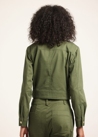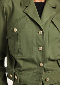 The Celinora Cropped Jacket in fatigue green is crafted from a uniquely soft stone-washed stretch cotton twill. It is tailored with a relaxed fit and cropped silhouette. It features two front utility cargo pockets and a front closure with gold crest buttons. SKU: TF512209COT - 61% Cotton, 37% Polyester, 2% Spandex - Imported SIZE & FIT Sleeve length is 32" based on a size S. Our model is 5’9” and is wearing a size S. This style runs true to size. FEATURES & DETAILS - Dry clean only