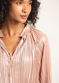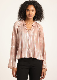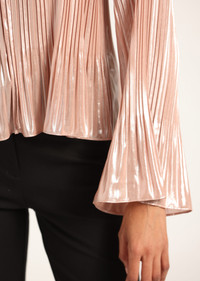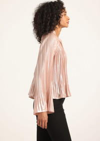 The Claira is a raglan blouse, crafted in a pleated foil fabric, with a babydoll silhouette and fluted sleeves. Designed with an integrated ruffle at the sleeve and hem. The blouse is unlined with a slightly oversized fit. Finished with a tie at the neckline and a ruffle collar stand. SKU: TF517448LMG - 100% Polyester - Imported SIZE & FIT Length from shoulder to hem is 23” | Sleeve Length is 32",based on a size S. Our model is 5’9” and is wearing a size S. This style runs true to size. FEATURES & DETAILS - Dry clean only