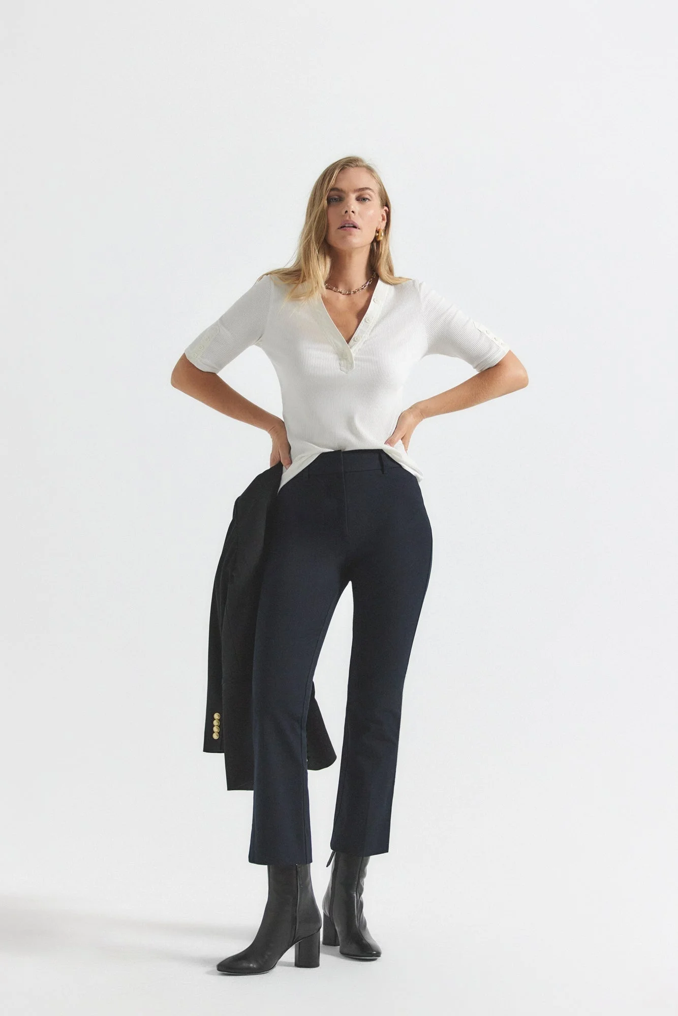 The Cropped Crosby Flare Trouser is a high-rise style with a slim fit from the waist through the thigh that flares below the knee and stops above the ankle. Based off our cult-favorite Robertson flared twill trouser. This pant features an ultra clean upper with a hidden zip fly plus hook-and-bar closure with back welt pockets. The press crease detail gives it a tailored finish. crafted in our bi-stretch crosby twill. Crafted with our bi-stretch crosby twill for extra comfort. SKU: TC00101CR - 96% Cotton 4% Elastane - Imported SIZE & FIT Front Rise Length is 9.25” and Inseam Length is 27.5”, based on a size 2. Model is 5’9.5” wearing a size 2. This item fits true to size. FEATURES & DETAILS - Dry clean - High Rise - Slim fit - Hook-and-bar closure - Back welt pockets