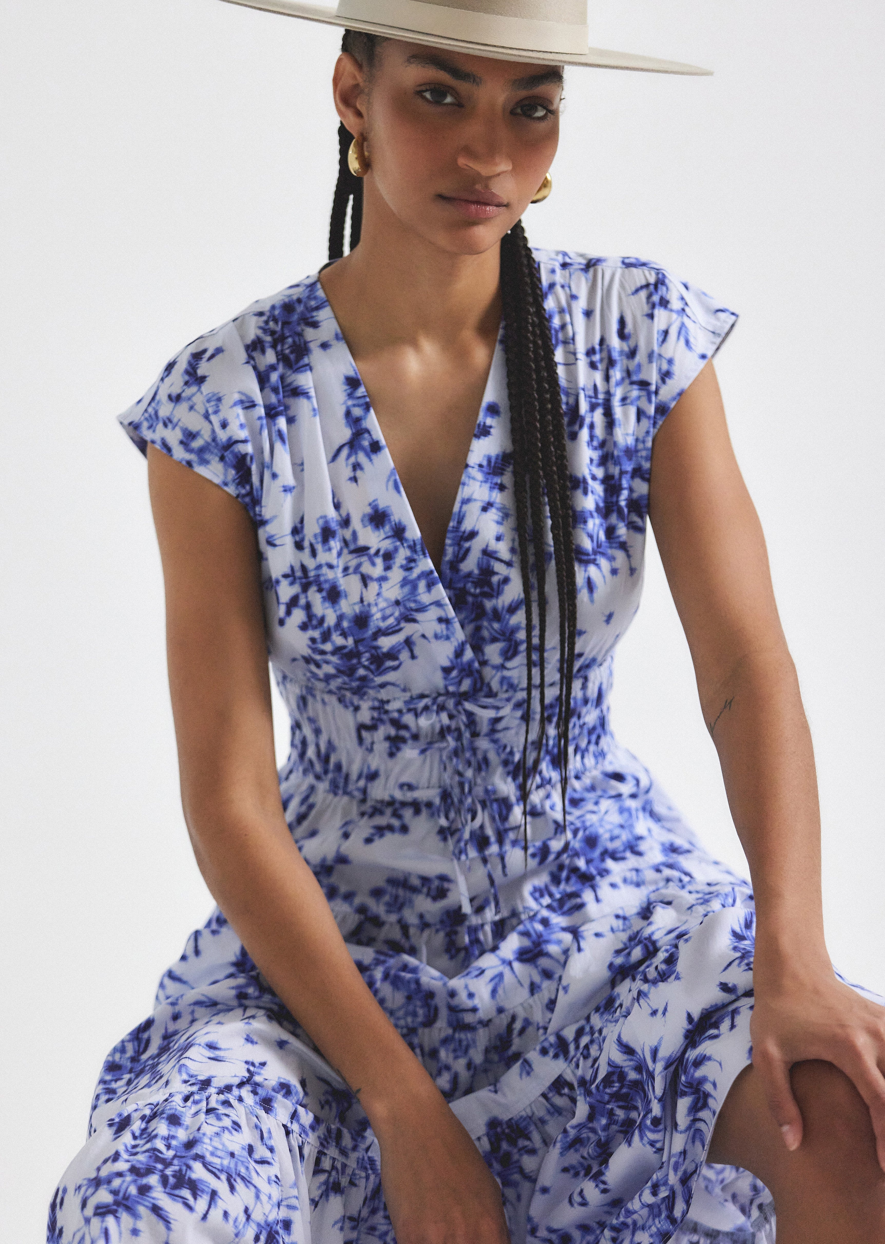 The Fatima Dress is a Derek Lam 10 Crosby classic reimagined in a seasonal print. It features a slightly extended shoulder, gathered waist, and fluid silhouette. SKU: TR515141CPP - 100% Cotton - Imported SIZE & FIT Model is wearing a size 2. Height 5’10” / Bust 33'' 1/2 / Waist 25'' / Hips 34'' 1/2 This style runs true to size. FEATURES & DETAILS - Dry clean