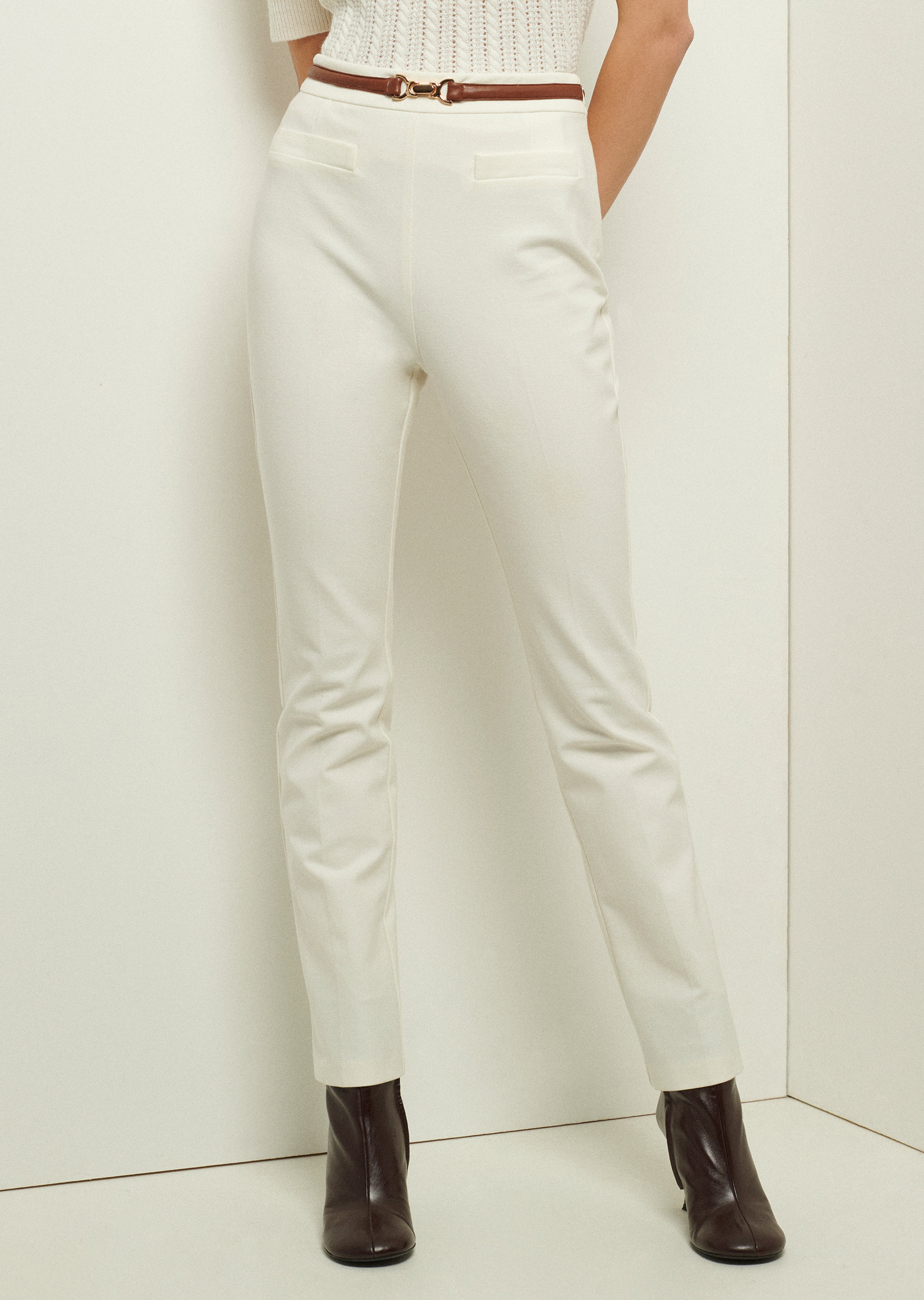 The Fia Slim Pant is made from our signature bi-stretch cotton Crosby twill. It features a high waist silhouette, fitted through the legs, with an antique gold interlocking belt buckle at the waistband. Finished with front and back welt pockets and an invisible zipper at the side seam.This style is made in our best-selling Crosby Twill stretch cotton. The comfortable 2-way stretch cotton twill is wrinkle-resistant and lends itself to good stretch and recovery. SKU: TR311081CR - 96% Cotton, 4% Elastane / Lining: 100% Cotton - Imported SIZE & FIT Model is wearing a size 2. Height 5’10.5” / Bust 32” / Waist 23.5” / Hips 34” This style runs true to size. FEATURES & DETAILS - Dry clean only
