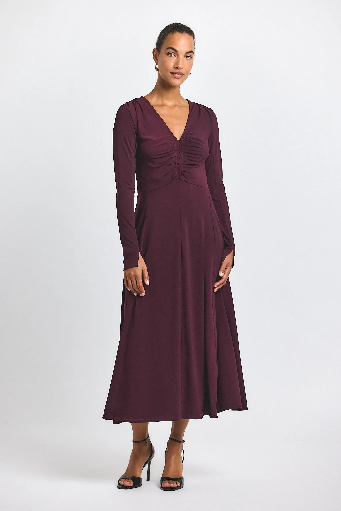 The Isabella Maxi Dress is crafted from a fluid matte jersey, with an A-line silhouette that skims the body. The sleeves are fitted, and feature an in-seam slit detail at the cuff. Elasticated tunnels trace the neckline, arm openings and side seams, with a ruching detail at the center front and sides. If smaller busted, please size down. SKU: TF525603CRJ - 95% Polyester, 5% Elastine - Imported SIZE & FIT Length from shoulder to hem is 49” and sleeve length is 31 5/8", based on a size S. Our model is 5’9” and is wearing a size S. This style runs true to size. FEATURES & DETAILS - Dry clean only