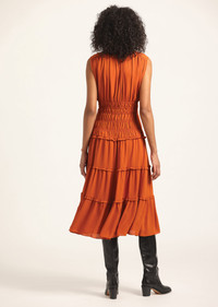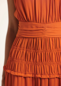 The Junia Rouched Sleeveless Midi Dress is an A-line style with a mock collar. It features slightly sheer waist panels and encased elastic with a fitted bodice. For a more relaxed fit, size up. SKU: TCOP5289AGGT - 100% Polyester / Lining: 100% Polyester - Imported SIZE & FIT Our model is 5’10” and is wearing a size 2. This style runs true to size. FEATURES & DETAILS - Dry clean only