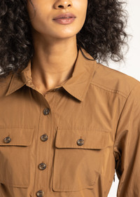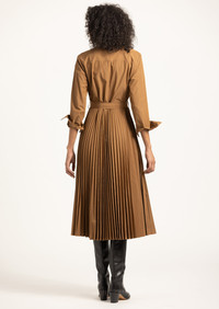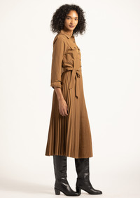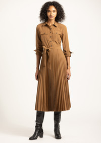 The Kenza Long Sleeve Pleated Shirt Dress is the perfect expression of feminine utility crafted from recycled cotton poplin fabrication. It features sunburst pleats on the skirt with slightly rounded patch pockets, back pleats and self belt for fastening. SKU: TCOP5309PPO - 58% Polyester, 42% Cotton - Imported SIZE & FIT Length from shoulder to hem is 49.5” and Sleeve Length is 31.75", based on a size 2. Our model is 5’10” and is wearing a size 2. This style runs true to size. FEATURES & DETAILS - Dry clean only