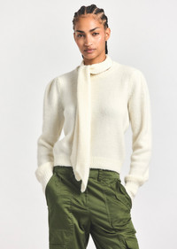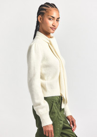 The Leilani plush sweater is a new staple for your everyday wardrobe. Made from a super soft yarn, the sweater features extended sleeves, pleating at the shoulder and rib trim on the cuff and hem. Complete with a neck tie that can be fashioned your way, or detached for a more classic look. Slightly cropped, with a regular fit. SKU: TF529373YBE - 31% Wool, 30% Acrylic, 24% Nylon, 15% Alpaca - Imported SIZE & FIT Length from shoulder to hem is 20.75". Sleeve Length is 25.5", based on a size S. Our model is 5’10” and is wearing a size S. This style runs true to size. FEATURES & DETAILS - Dry clean only