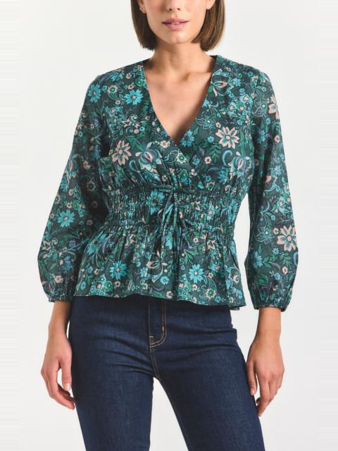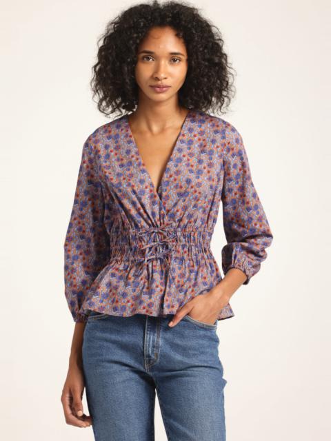 The Lilith V-Neck Blouse is the blouse equivalent of our bestselling Fatima dress, crafted from a fluid crep de chine with a tonal floral print. It features a fit and flare silhouette with a V-neckline, and a gathered waistline with three small bows. It falls to the waist with a flouncy hem and shirring details. SKU: TCOP7193CPP - 100% Viscose / Lining: 100% Polyester - Imported SIZE & FIT Model is 5'10 wearing a size 2. This style runs true to size. FEATURES & DETAILS - Dry clean only