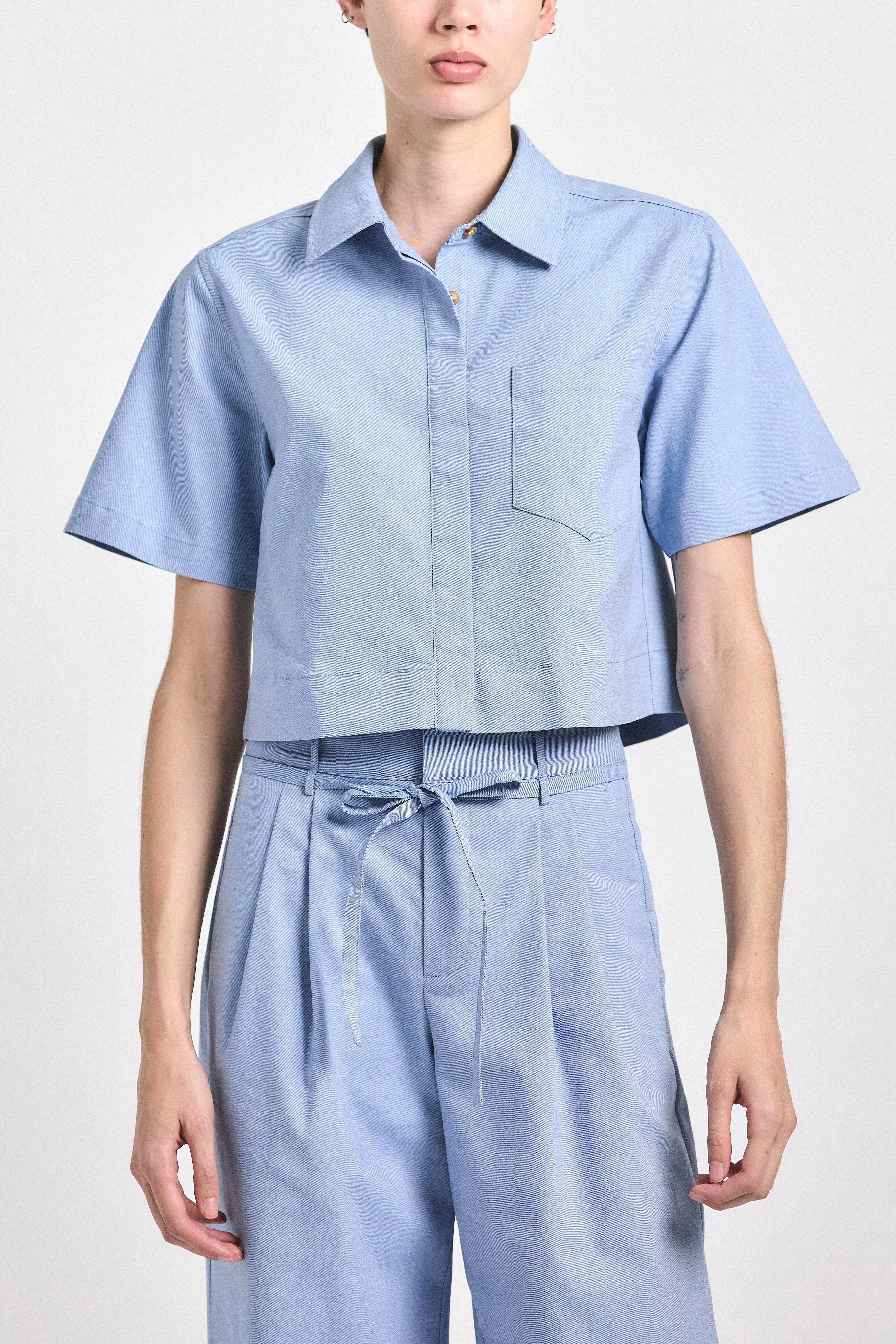 This cropped button-front shirt is tailored with clean lines and a softly structured silhouette. The abbreviated length creates proportion, while the crisp collar and single chest pocket ground the look in classic shirting detail. Designed to pair seamlessly with the coordinating trouser or styled back to denim for effortless polish. Minimal. Precise. Undeniably versatile. SKU: TCOP7514CHS - 58% Cotton, 38% Polyester, 4% Spandex - Imported SIZE & FIT Length from shoulder to hem Front 20", Back 19 1/2" | Shoulder 16 1/2" |Bust 38 1/2", based on a size S. This style runs true to size. FEATURES & DETAILS - Cropped silhouette - Short sleeves - Point collar - Chest pocket - Slightly boxy fit
