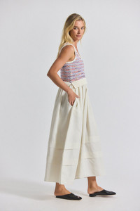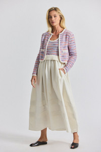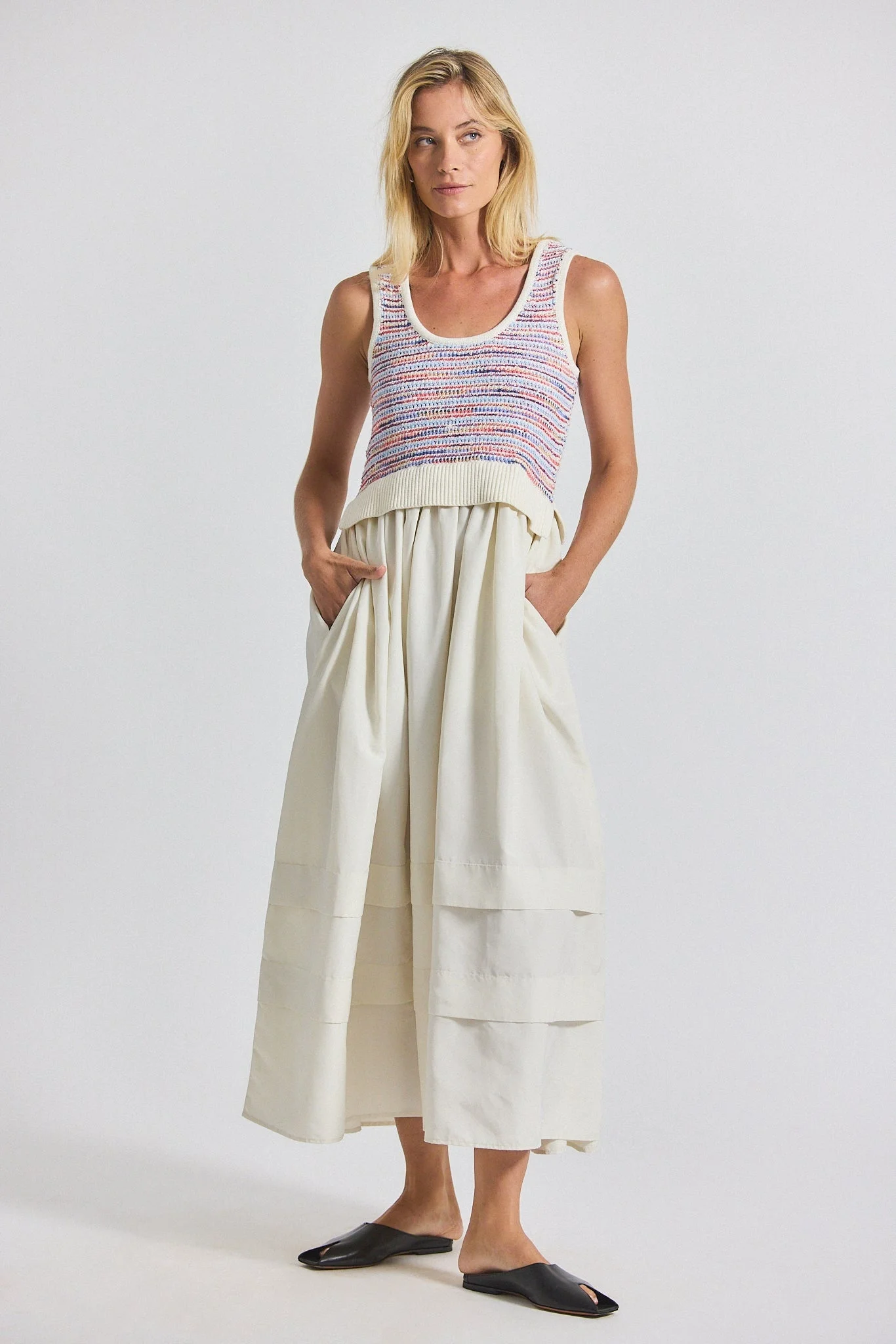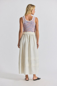 Made for summer days, the Loewel dress combines classic style and modern ease. With an A-line silhouette, the dress is constructed of a knitted tank top and a breathable cotton skirt. The skirt featuring gathering at the waist and overlaying details, falling to a midi length, while the top is richly textured with an intricate sequined yarn, complete with ribbed trimming and a slit at the sides of the knit. SKU: TP535520YAL - 58% Polyester, 48% Cotton - Imported SIZE & FIT Length from shoulder to hem is 51” based on a size S. Our model is 5’11” and is wearing a size S. This style runs true to size. FEATURES & DETAILS - Dry clean only