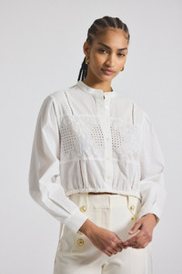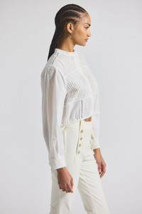 The Malory Garden Tile Eyelet Blouse features a gathered elastic waist, with side ties for a customizable fit. Embroidery, eyelet accents and ladder trim detailing add texture, while the collar stand and box pleat sleeves provide soft structure. The top is designed to fall right at the waist- perfectly paired with jeans or shorts for a casual look. SKU: TP517433HAN - 100% Cotton - Imported SIZE & FIT Length from shoulder to hem is Front 18 5/8", Back 18". Sleeve Length is 32", based on a size S. Our model is 5’10” and is wearing a size S. This style runs true to size. FEATURES & DETAILS - Dry clean only