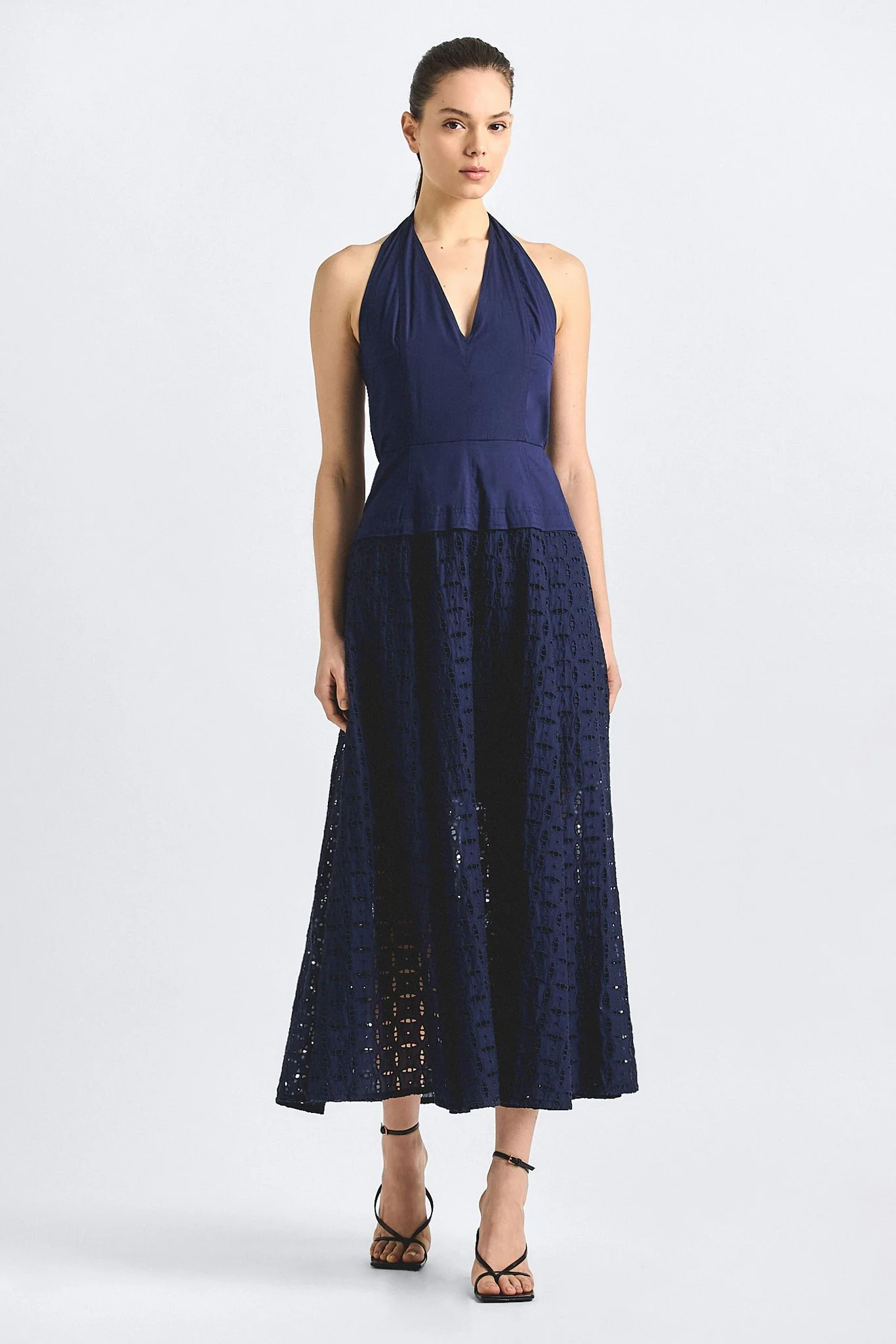 An elegant balance of romance and modern structure. This halter dress features a softly draped bodice with a deep V neckline, flowing into a delicately embroidered skirt that adds texture and movement. The tie-neck detail creates an elongated, open back silhouette, while the fitted waist defines the shape with understated refinement. A timeless piece designed for evenings, events, and elevated summer occasions. SKU: TS615650EVS - 55% Viscose, 45% Cotton | Lining: 100% Cotton - Imported SIZE & FIT Length from shoulder to hem 52" |Waist 27.5" | Hips 39", based on a size S. This style runs true to size. FEATURES & DETAILS - Halter neckline with adjustable tie-back closure - Soft V-neck front with fitted bodice - Defined waist for a flattering silhouette - Embroidered eyelet texture - Midi length with fluid A-line shape - Open back with elongated tie detail