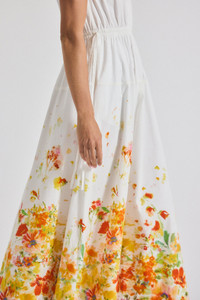The Nara Maxi Dress is a reimagined Derek Lam 10 Crosby classic, updated in a crisp white with an elegant degrade floral print. It features piping at the shoulders creating a soft gathering effect, and a faux wrap neckline that falls to a double elasticated waist. The A-line dress is crafted with a hip seam, hidden side pockets and fixed waist ties for a relaxed look. SKU: TP515527ACPP - 100% Cotton - Imported SIZE & FIT Length from shoulder to hem is 52.5”, based on a size 2. Our model is 5’11” and is wearing a size 2. This style runs true to size. FEATURES & DETAILS - Dry clean only