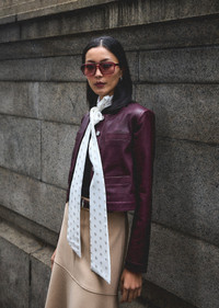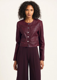 The Penny Jacket is a cropped style crafted in a stretch leather. It features a soft interior, gold novelty buttons and welt pockets on the front. SKU: TF522048STL - 100% Lamb Leather - Imported SIZE & FIT Sleeve Length is 31.5", based on a size 2. Our model is 5’10” and is wearing a size 2. This style runs true to size. FEATURES & DETAILS - Dry clean only