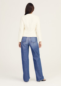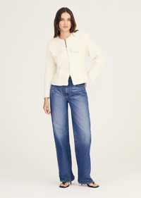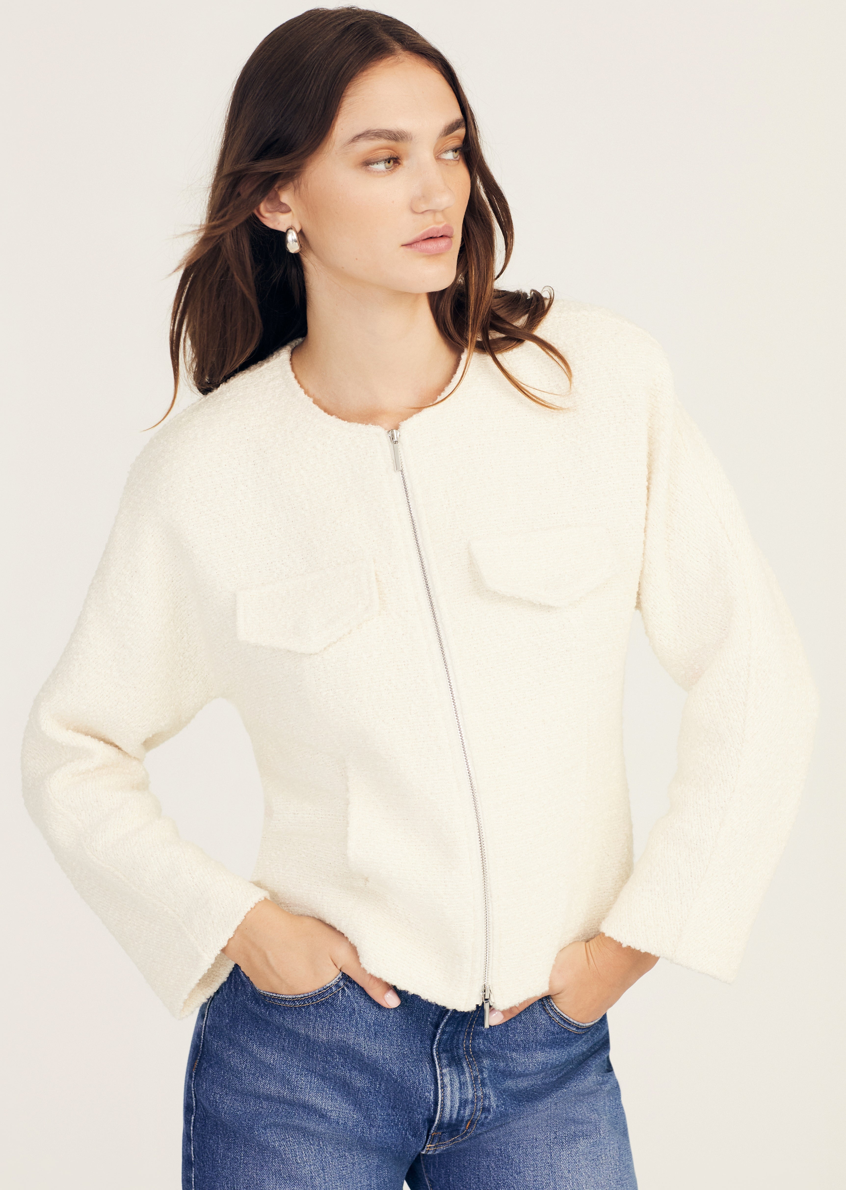 The Prewett Front Jacket is a softly structured style with an exposed two-way zipper closure. It features a slightly waisted fit, bracelet sleeves, and additional pockets on the side seams. SKU: TF422139ZWB - 58% Polyester, 24% Acrylic, 13% Wool, 5% Nylon / Lining:100% Polyester - Imported SIZE & FIT Model is wearing a size 2. Height 5’9” / Bust 31” / Waist 24.5” / Hips 35” This style runs true to size. FEATURES & DETAILS - Dry clean