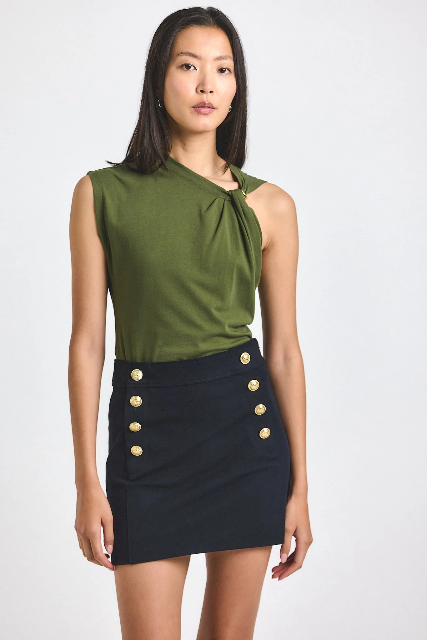 The Reyna Mini Skirt is made from our signature bi-stretch Crosby Twill. The A-line silhouette is fitted and gently tailored, with a side seam zip and gold sailor button details along the hips. SKU: TF514132CR - 96% Cotton, 4% Elastane - Imported SIZE & FIT Waist: 29", based on a size 2. Our model is 5’10” and is wearing a size 2. This style runs true to size. FEATURES & DETAILS - Cover metal embellishments with foil before dry cleaning.