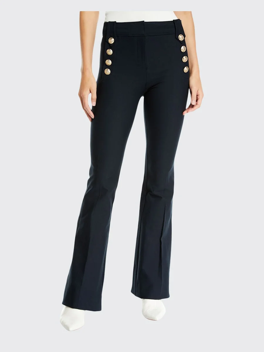 Derek Lam 10 Crosby trousers with sailor buttons. Mid-rise; concealed fly. Slim fit through thighs. Flared from knees. Cotton/spandex. Imported. Size Note: • Model Height: 5'11"/ waist 24”/ hips 34"/ bust 32" • Model is wearing size 2 Size Note: Item runs small, consider ordering a size up. Online Inquiries: BGS21_T8U5G| Store Inquiries: #2527459