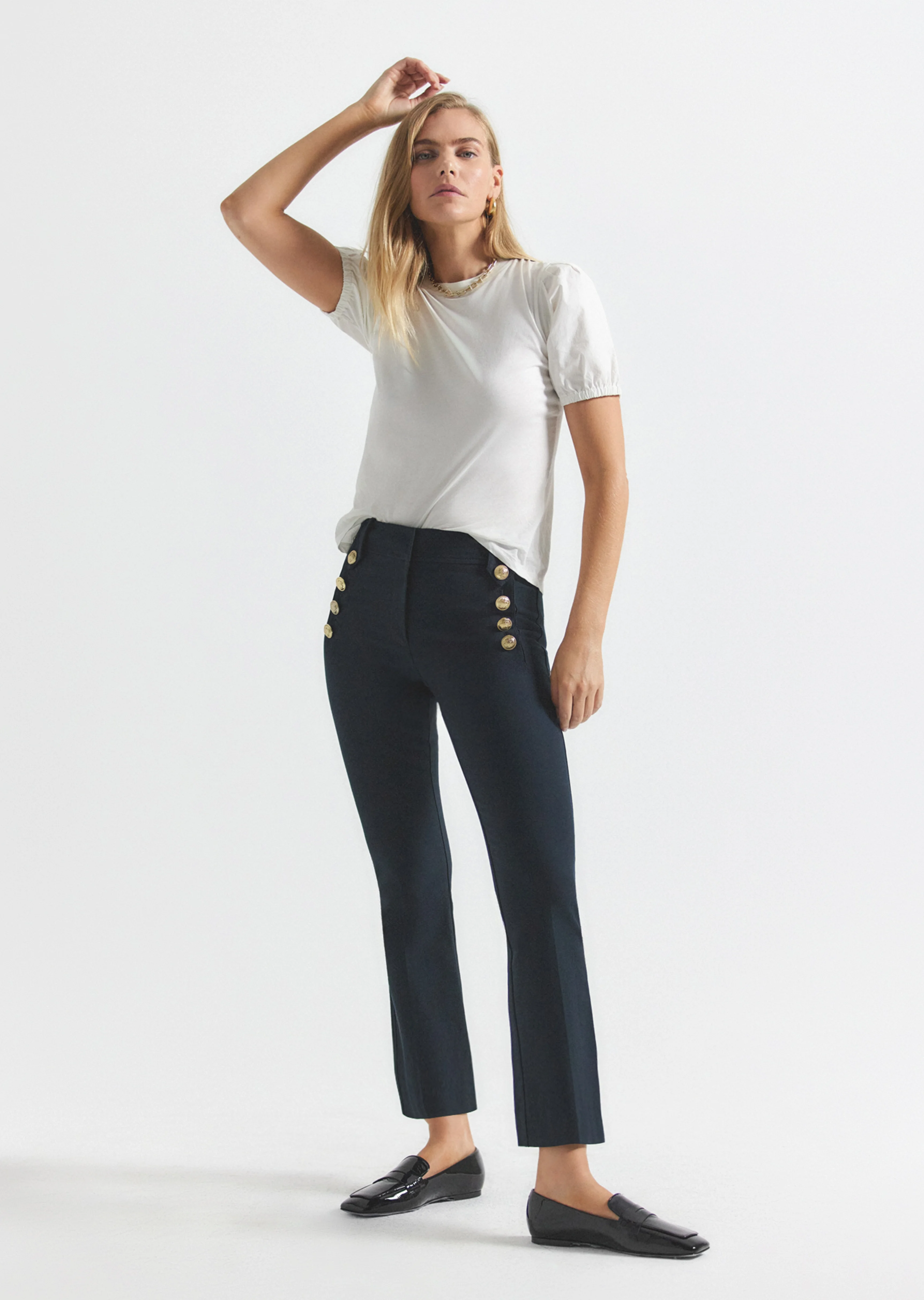 Our iconic cropped twill trouser, updated in a new slim silhouette, with silver sailor button details along the hips. Zip fly with button closure, flat front, tonal buttoned belt loops and stitching. SKU: TF511347CR - 96% Cotton, 4% Elastane - Imported SIZE & FIT Rise 11” | Inseam 27.5” | Leg Opening Circumference 13.5”, based on a size 2. Our model is 5’10” and is wearing a size 2. This style runs true to size. FEATURES & DETAILS - Cover metal embellishments with foil before dry cleaning.