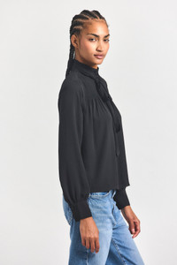The Valentine Necktie Blouse is a draped style with pintuck detailing along the front. It features an attached necktie and semi sheer sleeves. SKU: TCOP7269GGT - 100% Viscose / Lining: 100% Polyester - Imported SIZE & FIT Our model is 5’10” and is wearing a size 2. This style runs true to size. FEATURES & DETAILS - Dry clean only